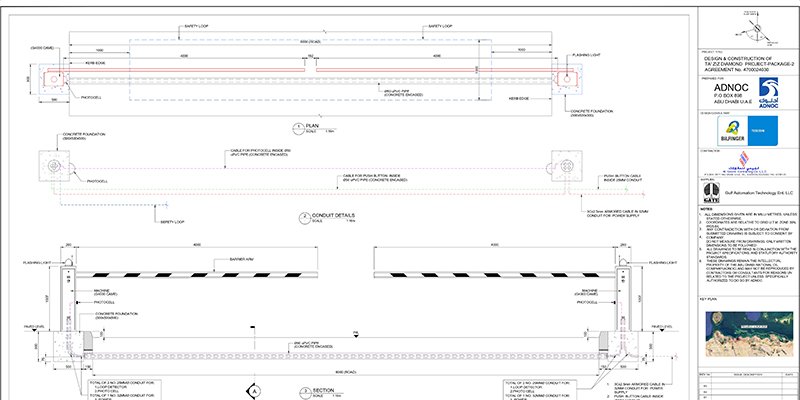 Prepared detailed gate barrier shop drawings for both single and double-arm systems, including layouts, cabling, conduit details, and sectional drawings.